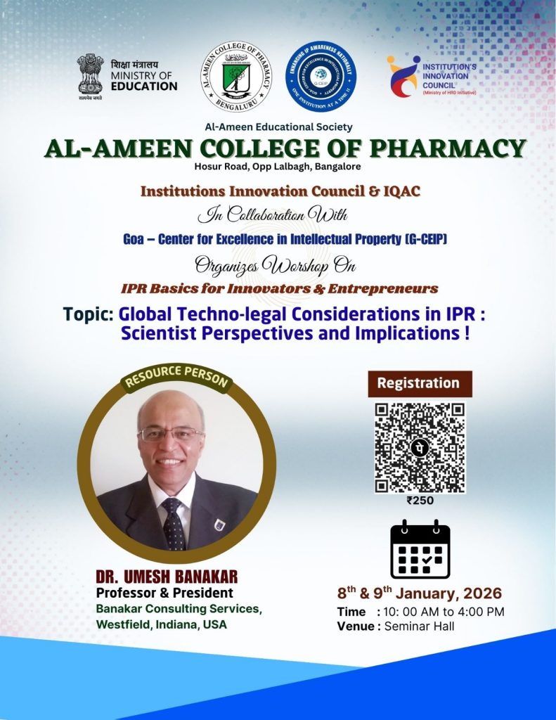 Two Days Professional Advancement Program on IPR (Course IV)- Nov. 08-09, 2026- Al-Ameen College of Pharmacy, Bangalore, INDIA